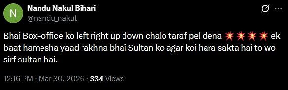 One more netizen tweeted, "Bhai Box-office ko left right up down chalo taraf pel dena 💥💥💥💥 ek baat hamesha yaad rakhna bhai Sultan ko agar koi hara sakta hai to wo sirf sultan hai (sic)." Check out the tweets below...