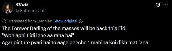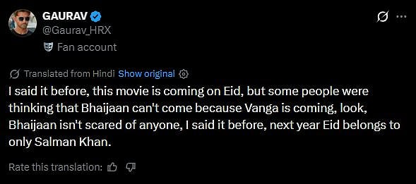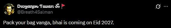 Another X user wrote, "I said it before, this movie is coming on Eid, but some people were thinking that Bhaijaan can't come because Vanga is coming, look, Bhaijaan isn't scared of anyone, I said it before, next year Eid belongs to only Salman Khan (sic)."