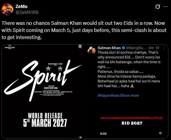 Reacting to the probable clash between Salman and Prabhas at the box office, a netizen tweeted, "There was no chance Salman Khan would sit out two Eids in a row. Now with Spirit coming on March 5, just days before, this semi-clash is about to get interesting (sic)."