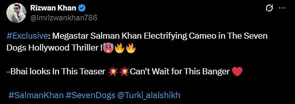 Salman's fans have gone crazy on social media as they feel that the actor is looking very charming in the teaser. A fan wrote, "Megastar Salman Khan Electrifying Cameo in The Seven Dogs Hollywood Thriller !🥵🔥🔥 -Bhai looks In This Teaser 💥💥Can't Wait for This Banger (sic)."