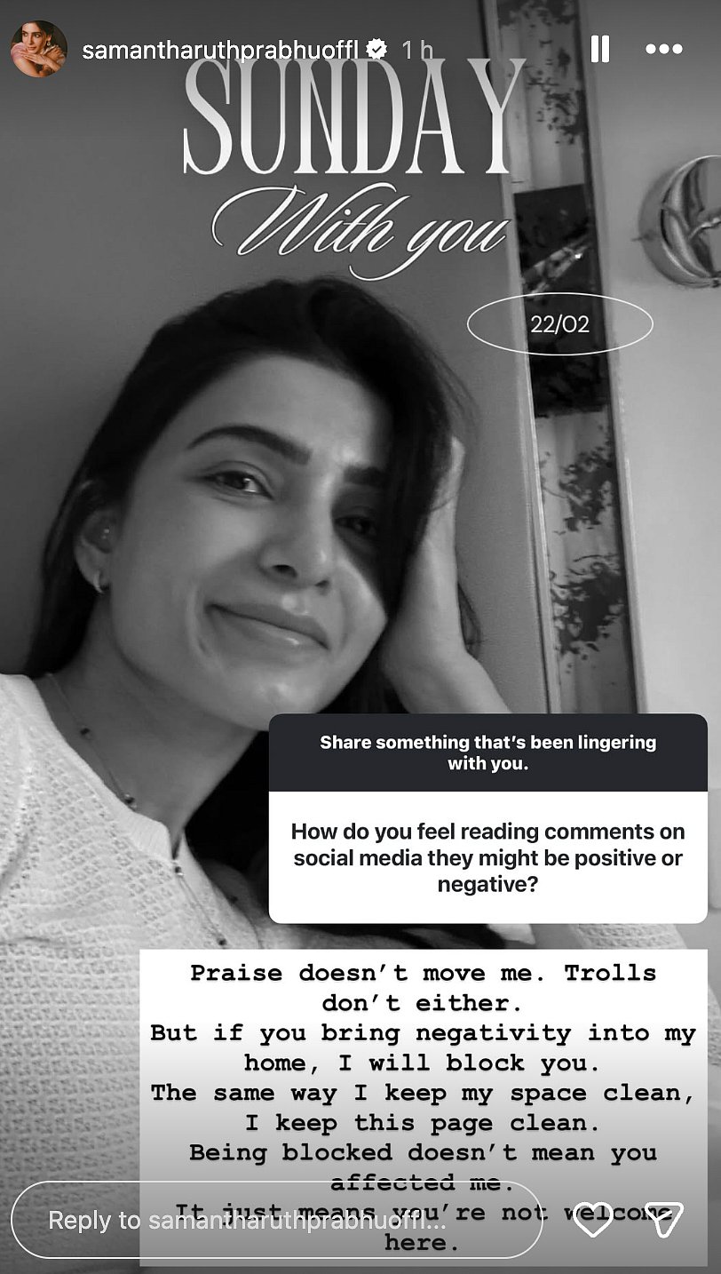 On Sunday, February 22, an user questioned Samantha, "How do you feel reading comments on social media they might be positive or negative?" In response, the actress gave a straight and powerful reply, saying, "Praise doesn't move me. Trolls don't either. But if you bring negativity into my home, I will block you. The same way I keep my space clean, I keep this page clean. Being blocked doesn't mean you affected me. It just means you're not welcome here."