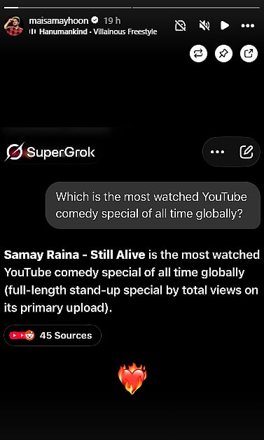 On April 21, Samay took to Instagram Stories to share a screenshot of his interaction with Grok AI, an AI assistant developed by X (formerly known as Twitter). He asked the chatbot, "Which is the most watched YouTube comedy special of all time globally?" To this, he received a reply, "Samay Raina - Still Alive is the most watched YouTube comedy special of all time globally (full-length stand-up special by total views on its primary upload)."