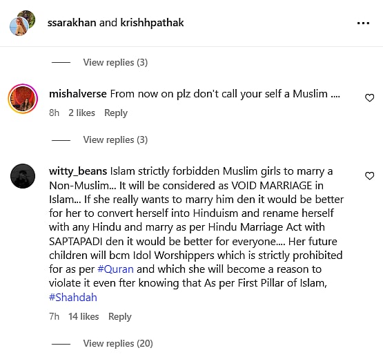 While many fans and friends from the entertainment industry congratulated the couple, the post also drew backlash from a section of social media users. Several Muslim netizens criticised Sara for marrying a Hindu man, claiming that such a union is not allowed in Islam.