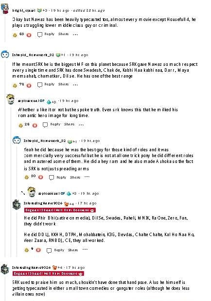 The clip caught fire on Reddit, and netizens quickly weighed in. Fans took to the virtual streets, expressing their frustration. Comments ranged from remarks about Nawaz's own typecasting to passionate defenses of SRK's varied career.