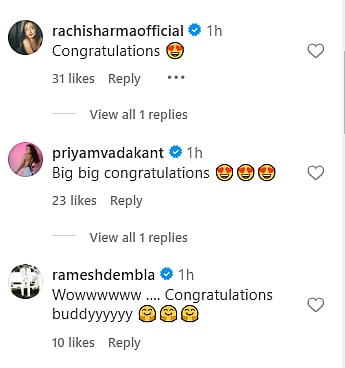Disha Parmar, also commented and wrote, "Wow! Congratulations (red heart emoji)."