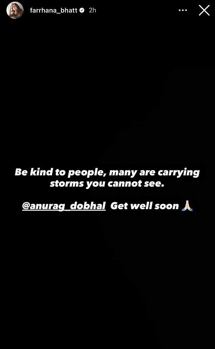 Farrhana Bhatt took to her Instagram story and wrote, "Be kind to people, many are carrying storms you cannot see. Get well soon."