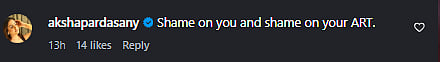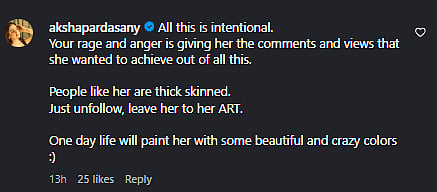 Actress Aksha Pardasany, who works in Telugu films, wrote, "All this is intentional. Your rage and anger is giving her the comments and views that she wanted to achieve out of all this. People like her are thick skinned. Just unfollow, leave her to her ART. One day life will paint her with some beautiful and crazy colors."