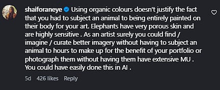 Film Director Shai commented, "Using organic colours doesn’t justify the fact that you had to subject an animal to being entirely painted on their body for your art. Elephants have very porous skin and are highly sensitive . As an artist surely you could find / imagine / curate better imagery without having to subject an animal to hours to make up for the benefit of your portfolio or photograph them without having them have extensive MU . You could have easily done this in AI."