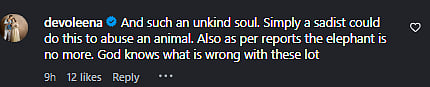 TV actress Devoleena Bhattacharjee wrote, "And such an unkind soul. Simply a sadist could do this to abuse an animal. Also as per reports the elephant is no more. God knows what is wrong with these lot."