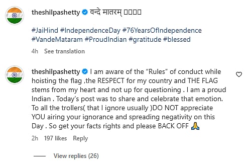 Shilpa was in no mood to ignore the trolls and she wrote in the comments section, "I am aware of the Rules of conduct while hoisting the flag, the RESPECT for my country and THE FLAG stems from my heart and not up for questioning. I am a proud Indian. Today’s post was to share and celebrate that emotion. To all the trollers (that I ignore usually) DO NOT appreciate YOU airing your ignorance and spreading negativity on this Day. So get your facts rights and please BACK OFF."