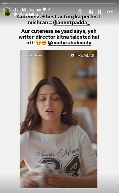 Praising Aneet’s performance, Shraddha wrote, "Cuteness + best acting ka perfect mishran = @aneetpadda (sic)". She then went on to compliment Rahul, adding, "Aur cuteness se yaad aya, yeh writer-director kitna talented hain uff @modyrahulmody.(sic)".