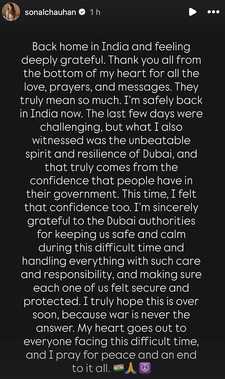 Actress Sonal Chauhan, best known for her role in Jannat, has finally returned to India days after being stranded in Dubai following the suspension of flight operations amid escalating tensions in the Middle East, including missile strikes by the United States and Israel on Iran on February 28. Informing her fans, Sonal took to her Instagram Stories on Tuesday, March 3, to share the update and expressed deep gratitude for the support she received during the difficult period.