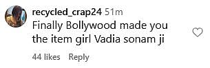 A netizen commented, "You nailed it." Another Instagram user wrote, "Finally Bollywood made you the item girl Vadia sonam ji (sic)." One netizen commented, "Gareebo ki nora fatehi (sic)." Check out the comments below...
