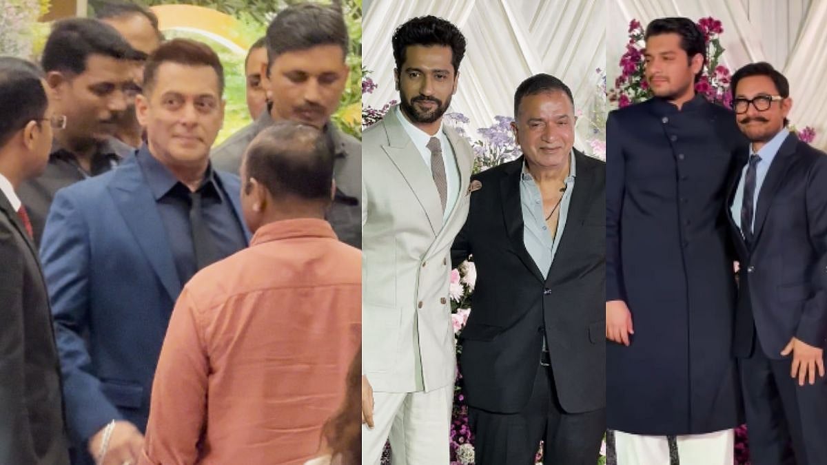 Bollywood superstar Aamir Khan arrived at the wedding reception with his son Junaid Khan. Aamir looked dapper in a blue suit, while his son opted for a traditional bandhgala in ethnic tones.