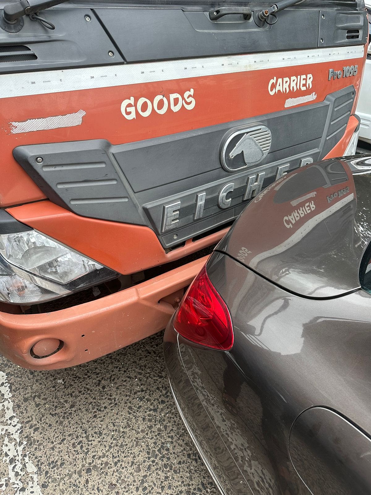 In the photos that have surfaced, the car can be seen rammed by the truck from behind, damaging the rear side of the vehicle.