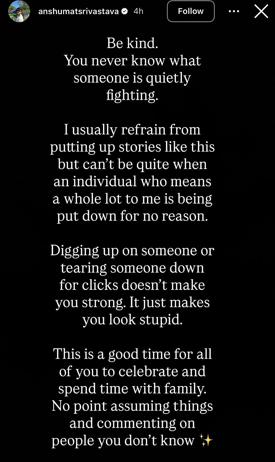 On Tuesday, December 20, Anshumat took to his Instagram story and wrote, "Be kind. You never know what someone is quietly fighting. I usually refrain from putting up stories like this but can't be quite when an individual who means a whole lot to me is being put down for no reason."