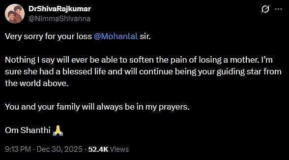 Kannada veteran actor Shiva Rajkumar tweeted, "Very sorry for your loss @Mohanlal sir. Nothing I say will ever be able to soften the pain of losing a mother. I’m sure she had a blessed life and will continue being your guiding star from the world above. You and your family will always be in my prayers. Om Shanthi (sic)."