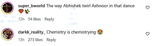 Fans of Abhishek and Ashnoor are very happy to see them together. A fan commented on the video, "The way Abhishek twirl Ashnoor in that dance (sic)." Another Instagram user wrote, "Sorry but this is giving couple energy (sic)."