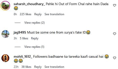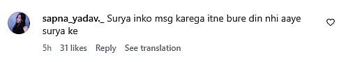 Another Instagram user wrote, "Yes i Know wo mere office ka ek Yadav bhai hai security wo karta tha message (sic)." One more netizen commented, "Surya inko msg karega itne bure din nhi aaye surya ke (sic)."