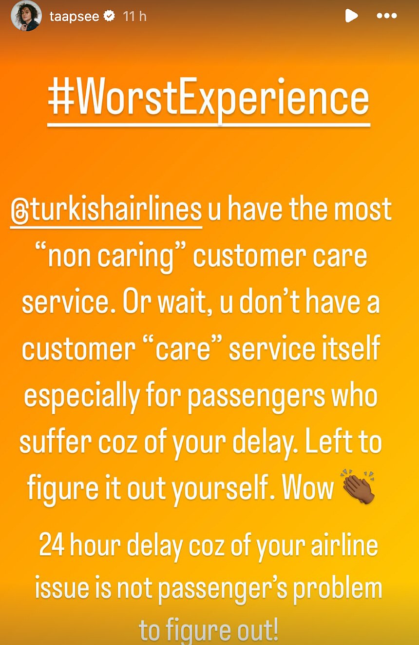 Taking to her Instagram story, Taapsee wrote, "#WorstExperience @turkishairlines u have the most "non caring" customer care service. Or wait, u don't have a customer "care" service itself especially for passengers who suffer coz of your delay. Left to figure it out yourself. Wow 24 hour delay coz of your airline issue is not passenger's problem to figure out!"