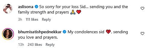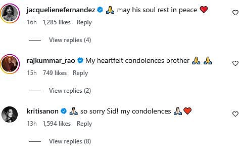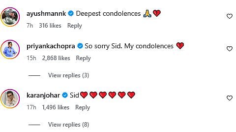 Many Bollywood celebs like Kriti Sanon, Bhumi Pednekar, Sonakshi Sinha, Jacqueline Fernandez, Priyanka Chopra, and others commented on Sidharth's post, and sent him condolences. Check out their comments below...