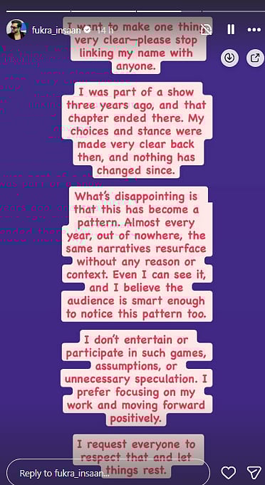 Addressing the speculation, Abhishek took to his Instagram story on January 1 to set the record straight. “I want to make one thing very clear -please stop linking my name with anyone. I was part of a show three years ago, and that chapter ended there. My choices and stance were made very clear back then, and nothing has changed since,” he wrote.