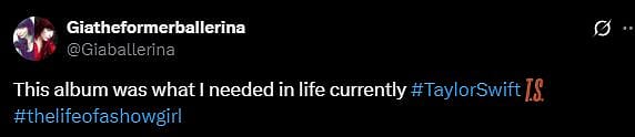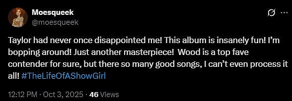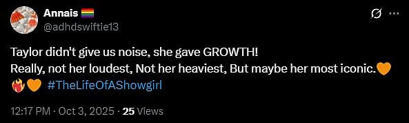 Another X user wrote, "Taylor didn't give us noise, she gave GROWTH! Really, not her loudest, Not her heaviest, But maybe her most iconic (sic)."