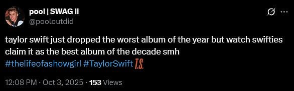 While of the X users are praising it, one netizen called it 'worth album'. The netizen wrote, "Taylor Swift just dropped the worst album of the year but watch swifties claim it as the best album of the decade smh (sic)." Check out the tweets below...
