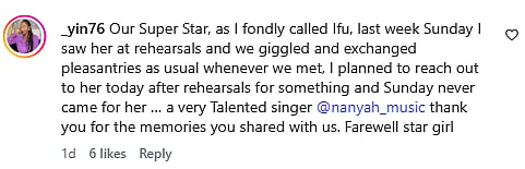 Reacting to the news of her demise, a netizen commented, "Our Super Star, as I fondly called Ifu, last week Sunday I saw her at rehearsals and we giggled and exchanged pleasantries as usual whenever we met, I planned to reach out to her today after rehearsals for something and Sunday never came for her … a very Talented singer @nanyah_music thank you for the memories you shared with us. Farewell star girl (sic)."
