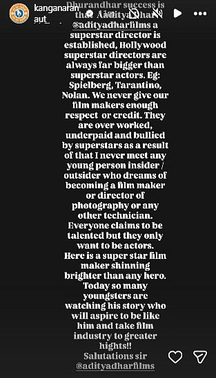 On Saturday, March 21, Kangana took to her Instagram story and wrote, "The best thing about Dhurandhar success is that Aditya Dhar is a superstar director is established, Hollywood superstar directors are always bigger than superstar actors. Eg: Spielberg, Tarantino, Nolan. We never give our film makers enough respect or credit. They are over worked, underpaid and bullied by superstars as a result of that I never meet any young person insider/ outsider who dreams of becoming a film maker or director of photography or any other technician."