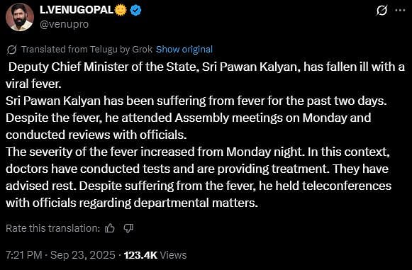 On Tuesday, the PRO of the actor took to social media to inform everyone that Pawan Kalyan is not keeping well. He tweeted, "Deputy Chief Minister of the State, Sri Pawan Kalyan, has fallen ill with a viral fever. Sri Pawan Kalyan has been suffering from fever for the past two days. Despite the fever, he attended Assembly meetings on Monday and conducted reviews with officials."