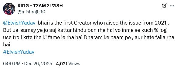 Another X user tweeted, "@ElvishYadav bhai is the first Creator who raised the issue from 2021 . But us samay ye jo aaj kattar hindu ban rhe hai vo inme se kuch % log use troll krte the ki fame le rha hai Dharam ke naam pe , aur hate faila rha hai (sic)."