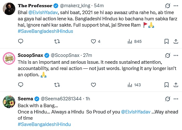 Reacting to Elvish's tweet, a netizen wrote, "Not a big fan of him but as far as i know previously he raised his voice for Bangladeshi hindus and now again he's not taking words back W's for him (sic)."