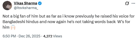 He tweeted, "This is not just about posting stories or making a few statements. The situation demands serious and sustained attention. I raised this concern back in 2021 and in 2024 through a video about the condition of Bangladeshi Hindus, and I am reiterating it today."
