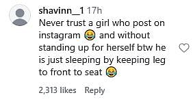 A netizen commented, "Never trust a girl who post on instagram 😂 and without standing up for herself btw he is just sleeping by keeping leg to front to seat (sic)."