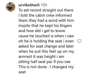 Urvi captioned the video as, "This is why women are always alert. Even on a plane (sic)." Later, in the comments, the actress wrote, "To set record straight out there i told the cabin crew informed them they had a word with him inspite that he kept his fingers and how did i get to know cause he touched is when i saw oh he is holding the seat i even asked for seat change and later when he put this feet up on my armrest it was height i am sitting half seat par if you see. This is not done. I changed my seat (sic)." Watch the video below...
