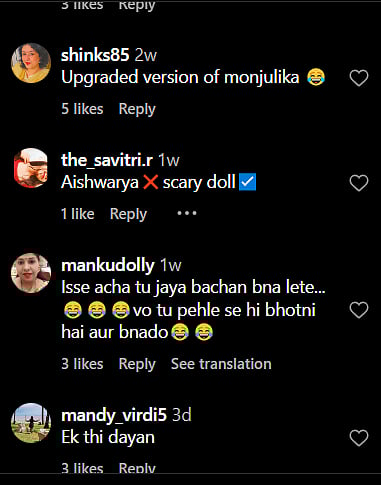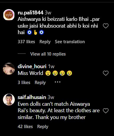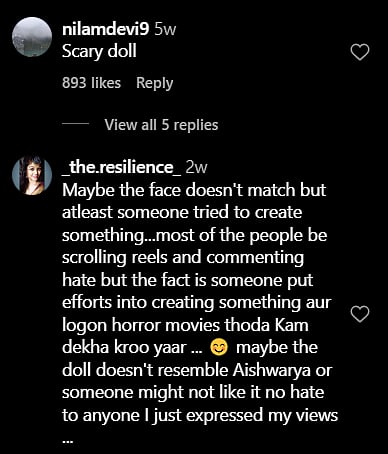 However, some people praised the artist and the work they did to create Aishwarya Rai Bachchan's doll. The third user wrote, "Maybe the face doesn't match but at least someone tried to create something. Most of the people be scrolling reels and commenting hate but the fact is someone put efforts into creating something aur logon horror movies thoda Kam dekha kroo yaar. Maybe the doll doesn't resemble Aishwarya or someone might not like it no hate to anyone I just expressed my views."