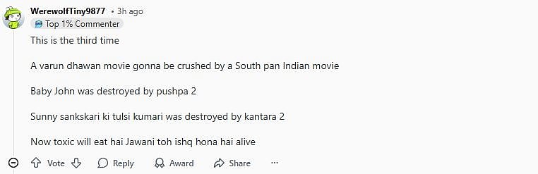 One more Reddit user wrote, "This is the third time A varun dhawan movie gonna be crushed by a South pan Indian movie. Baby John was destroyed by pushpa 2. Sunny sankskari ki tulsi kumari was destroyed by kantara 2. Now toxic will eat hai Jawani toh ishq hona hai alive (sic)." Check out the comments below...