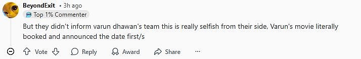 Another netizen commented, "But they didn't inform Varun Dhawan's team this is really selfish from their side, Varun's movie literally booked and announced the date first/s (sic)."