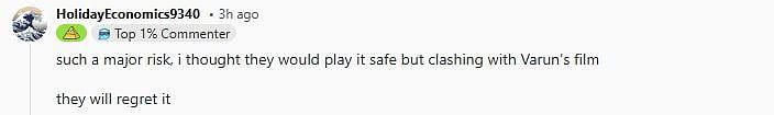 Reacting to the clash between Toxic and Hai Jawani Toh Ishq Hona Hai, a Reddit user wrote, "Such a major risk, i thought they would play it safe but clashing with Varun's film they will regret it (sic)."