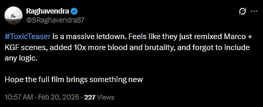 A netizen tweeted, "#ToxicTeaser is a massive letdown. Feels like they just remixed Marco + KGF scenes, added 10x more blood and brutality, and forgot to include any logic. Hope the full film brings something new (sic)."