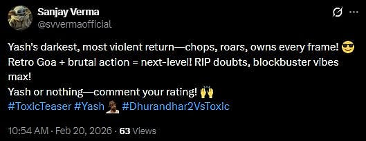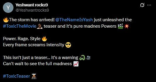 Another X user wrote, "Yash's darkest, most violent return—chops, roars, owns every frame! 😎 Retro Goa + brutal action = next-level! RIP doubts, blockbuster vibes max! Yash or nothing—comment your rating! (sic)."