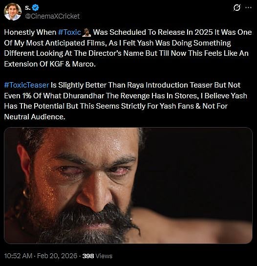One more netizen tweeted, "Honestly When #Toxic Was Scheduled To Release In 2025 It Was One Of My Most Anticipated Films, As I Felt Yash Was Doing Something Different Looking At The Director’s Name But Till Now This Feels Like An Extension Of KGF & Marco. #ToxicTeaser Is Slightly Better Than Raya Introduction Teaser But Not Even 1% Of What Dhurandhar The Revenge Has In Stores, I Believe Yash Has The Potential But This Seems Strictly For Yash Fans & Not For Neutral Audience (sic)." Check out the tweets below...