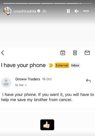 The subject of the said email read, "I have your phone". The message read, "I have your phone. If you want it, you will have to help me save my brother from cancer." Urvashi shared a screenshot of the email with a thumbs up emoticon. However, she did not write anything along with it.