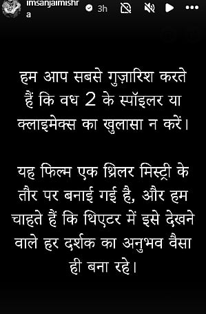 Meanwhile, Mishra's IG Story in Hindi stated: "Hum aap sabse guzaarish karte hain ki Vadh 2 ke spoilers ya climax ka khulaasa na karein. Yeh film ek thriller mystery ke taur par banayi gayi hai, aur hum chahte hain ki theatre mein ise dekhne wale har darshak ka anubhav waisa hi bana rahe."