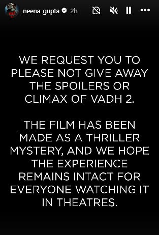 Neena posted on her Instagram story, "We kindly ask you not to reveal the spoilers or climax of Vadh 2. The film has been crafted as a thrilling mystery, and we hope the experience stays intact for everyone watching it in theaters."