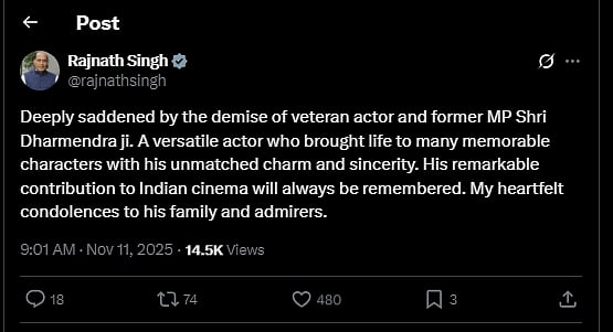 Around 9 am today, Defence Minister Rajnath Singh also confirmed his death. "Deeply saddened by the demise of veteran actor and former MP Shri Dharmendra ji. A versatile actor who brought life to many memorable characters with his unmatched charm and sincerity," he wrote on X.
