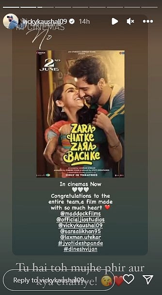 Reacting to her wife's post, Vicky re-shared the post and dedicated his film's song 'Phir Aur Kya Chahiye' line "Tu hai toh mujhe phir aur kya chahiye!"