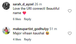 In the 2019 release, Vicky's character name was Major Vihaan Singh Shergill. So, the actor has played the character of his son's name in the past. Many fans of Vicky noticed this, and they started commenting on the couple's post. Check out the comments below...