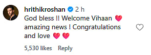 Hrithik Roshan commented on the post, "God bless !! Welcome Vihaan ❤️ amazing news ! Congratulations and love (sic)."
